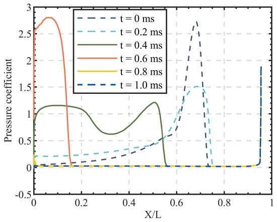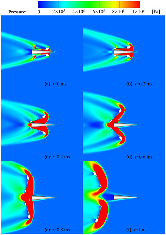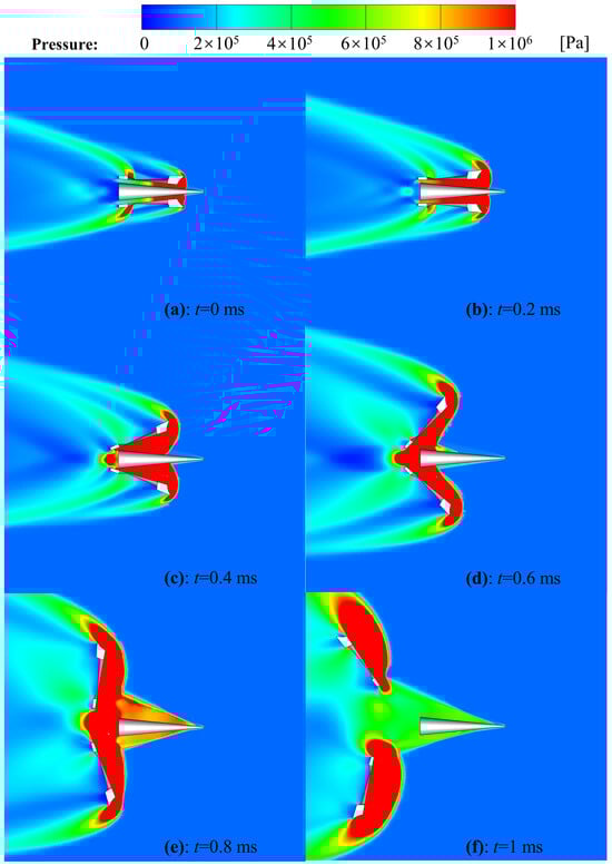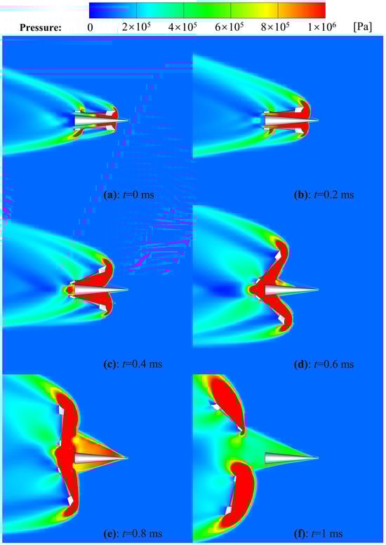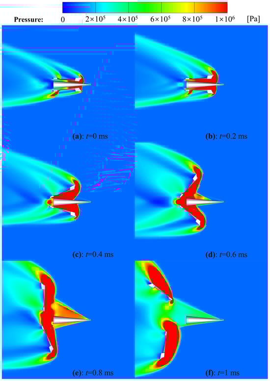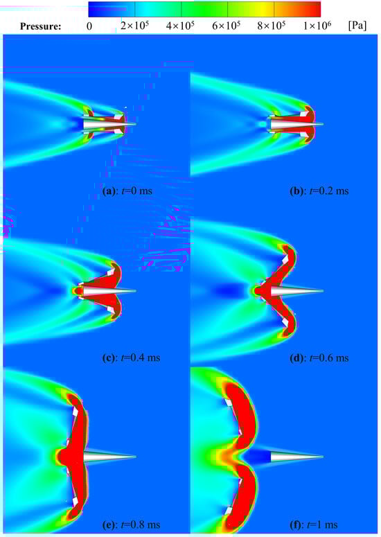 With the gap increasing, the intensity of the reflected shock wave decreases. Eventually, the reflection of the oblique shock wave on the inner surface of the sabot will disappear. The oblique shock wave only acts on the flight body’s tail, and the reflected shock wave no longer affects the sabot discard, as shown in Figure 12d with the pressure distribution at t = 0.6 ms in Figure 13. When the distance between the sabot and the flight body is large enough, the aerodynamic interference between them disappears, as shown in Figure 12e,f with the pressure distribution at t = 0.8 ms and t = 1 ms in Figure 13.