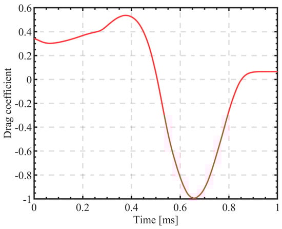 Figure 14 shows the variation in the flight body’s drag coefficient with time during the symmetric sabot discard. The gap between the sabot and the flight body is small in the early stage. As the sabot slightly opens, the high-pressure gas in the front cavity of the sabot moves towards the rear, causing the range of the high-pressure area to increase, as shown in Figure 12a,b with the pressure distribution at t = 0 ms and t = 0.2 ms in Figure 13. The drag of the flight body tends to increase and reaches a peak at 0.376 ms. At this moment, the drag coefficient is 0.3566, and the discard angle of the upper and lower sabot segments are 20.98 Deg and −20.98 Deg, respectively.