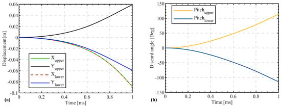 The discard trajectories of the sabot are shown in Figure 15. The X-direction displacements of the upper and lower sabot segments have coincided with each other, and the Y-direction displacements of the upper and lower sabot segments are symmetric, with a calculation error of less than 0.14%. The discard angles of the upper and lower sabot segments are symmetric. The AVODA is 114.5 Deg, and the calculation error is less than 0.2%.
