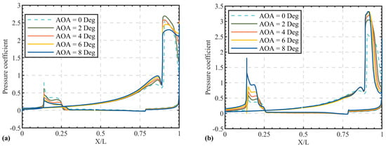 Figure 7 illustrates the pressure contours of the flow field for Case 1. The incoming flow generates a detached shock wave at the nose of the flight body. Due to the relatively small obtuse angle of the body, the distance to the detached shock wave is relatively short. At AOAs 0 Deg, the flow field around the body shows obvious asymmetry. The lower side of the body experiences an increase in pressure due to the direct impact of the airflow, whereas the upper side, oriented downwind, experiences a decrease in pressure. As the AOA increases, this asymmetry becomes more apparent, with pressure on the lower side rising and pressure on the upper side falling.