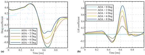 The variations in the lift and drag coefficient of the flight body with time during the sabot discard process at different AOAs are shown in Figure 21. The drag coefficient curves almost overlap in the early stage of the sabot discard before the drag is transformed into thrust. However, after the drag is transformed into thrust, there are apparent differences in the drag changes in the flight body at different AOAs. Regarding the thrust of the flight body, as the AOA increases, the peak value and duration of the thrust decrease. The lift change in the flight body is pronounced because of the changed direction of the incoming flow and the asymmetry of discard. The peak value of the lift coefficient increases with the increase in the AOA. It can be observed from the changes in the drag and lift of the flight body that the asymmetric discard of the sabot causes an evident disturbance to the flight body. The disturbance is more apparent with the increase in the asymmetry.