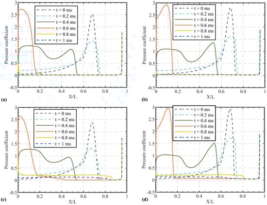 Figure 12 illustrates the pressure contour of the flow field at different moments under the symmetric discard of the sabot. Figure 13 shows the pressure distribution on the surface of the flight body at different moments.