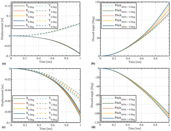 Discard trajectories at different AOAs: (a) displacement of the upper sabot segment; (b) discard angles of the upper sabot segment; (c) displacement of the lower sabot segment; and (d) discard angles of the lower sabot segment.