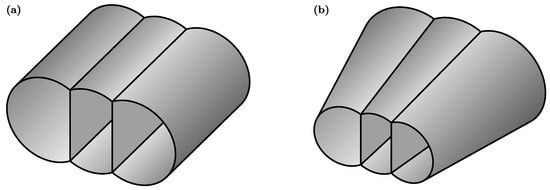 Multi-bubble tanks can be designed in various configurations to meet diverse structural and storage requirements. In 2012, Geuskens advanced the understanding in the design and analysis of conformable storage tanks with intersecting cylindrical shells arranged parallel to one other, often referred to as a cylindrical multi-bubble tank []. Figure 3a shows a cylindrical three-bubble shell geometry composed of a series of three cylindrical shells of equal radius. Rectangular web reinforcements in between two cylindrical bubbles are required to transfer circumferential tensile forces in the shell as a result of the internal differential pressure. Geuskens et al. [,] showed that the orientations of the primitive members always align with the orientations of resulting internal forces in a cylindrical multi-bubble tank, regardless of the radii or separation distance between the bubbles. This property makes the cylindrical multi-bubble concept a highly efficient structure in terms of weight and volume in certain applications, such as a pressurized box-type BWB fuselage [,,]. Spherical and toroidal multi-bubble structures have been analysed in addition to the cylindrical multi-bubble concept in the construction of a multi-bubble pressure cabin [,,]. In the context of LH2 storage, Tapeinos et al. [] proposed a spherical multi-bubble pressure tank that solely consists of spherical shells joined together at appropriate intersections. Zingoni et al. [] presented the spherical multi-bubble construction of elevated high-capacity liquid-storage vessels, where hydrostatic pressure is the primary load case.