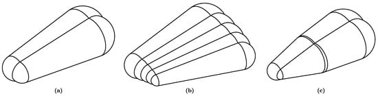 The tapered and flattened aircraft designs of a BWB and pure FW aircraft pose a challenge in accommodating LH2 storage tanks. While cylindrical multi-bubble tanks have been shown to be effective in certain applications, their design is limited to two dimensions. Malfroy et al. introduced the concept of a tapered multi-bubble pressure tank []. The conical shells in the design of a tapered multi-bubble tank provide additional design degrees of freedom in the third dimension. Figure 3b shows a tapered three-bubble shell geometry composed of a series of three conical shells with relatively small taper angles. The tapered multi-bubble tank provides enhanced storage capacities over cylindrical multi-bubble tanks, all while maintaining high structural efficiency attributed to the axial symmetry in each bubble of the tank. In contrast to cylindrical multi-bubble tanks, however, tapered multi-bubble tanks are not inherently structurally efficient. Malfroy et al. [] showed that the orientations of the primitive members align with the orientations of resulting internal forces only if the webs are planar. Web planarity has been shown to be a fundamental requirement in the design of a tapered multi-bubble tank, but it adds significant complexity to the design process through constraints on the geometry parameters.