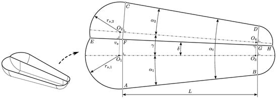 Web planarity has been shown to be a fundamental requirement in the design of a tapered two-bubble tank to guarantee structural efficiency []. Equation (2) must be satisfied, reducing the number of independent geometry descriptors in the parameter set from six to five. With five independent geometry descriptors in , of which at least two are in each subset and , the geometry is fully defined. It is also an option to select or (Figure 5) as an independent geometry descriptor, but this reduces the number of independent geometry descriptors in by one. The length L is an additional independent geometry descriptor alongside the five independent geometry descriptors in .