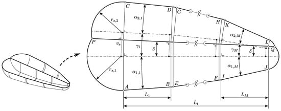 The parameter set gives a complete set of independent geometry descriptors required for the description of a tapered multi-segment two-bubble tank. The length of the entire assembly is determined by the individual lengths measured between the two ends of the first conical lobe in each segment. The total length of the assembly of all segments is added to Figure 7. For or , the tapered multi-segment two-bubble tank from Figure 7 reduces to the tapered two-bubble tank from Figure 5 with and . All nonzero geometry descriptors in contribute to the total taper angle of the entire assembly and lead to a variable cross-section of the tank in the longitudinal direction.