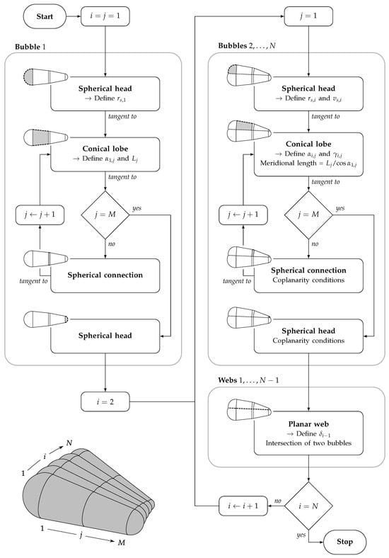 The design procedure shown in Figure 8 starts with the description of the first bubble (). The first bubble of a tapered multi-segment multi-bubble tank consists of a series of conical lobes with collinear axes of revolution. Each conical lobe defines a segment of the tank. Attached to the first lobe () and the last lobe () are two spherical heads. Spherical connections are added in between two lobes. The parameter set () fully defines the geometry of the first bubble. Any additional bubble () is defined in a similar way to the first one. The relative position of two consecutive bubbles is determined by the distance between the centres of the spherical heads of radii and . The relative orientation of two consecutive lobes in the jth segment is determined by the angle between the two axes of revolution of these two lobes. Figure 5, Figure 6 and Figure 7 serve as a template if , or , respectively, but other configurations using Figure 8 can be obtained too.