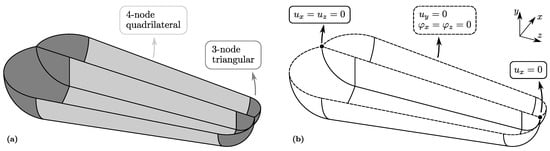 The validation case is a thin-walled tapered two-bubble tank that is in agreement with the design properties discussed in Section 2.1.3. The 3D geometry of such a tapered two-bubble tank featuring a planar web is generated following the step-by-step design process shown in Figure 8 for and . Figure 5 serves as a 2D template for the geometry descriptors. With five independent geometry descriptors in , of which at least two are in each subset and , the geometry is fully defined (Section 2.1.2). All size parameters (, and ) in are selected as independent geometry descriptors, leaving only two independent geometry descriptors in . The angle is also selected as an independent geometry descriptor, further reducing the number of independent geometry descriptors in from two to one. The angle is selected as the independent geometry descriptor in . The length L is an additional independent geometry descriptor alongside the five independent geometry descriptors , , , , and . Numerical values for this total set of six independent geometry descriptors are randomly selected and listed in Table 1. For this selection of independent geometry descriptors, the geometry is fully defined. The remaining geometry descriptors in Figure 5 are , and and their numerical values depend on the numerical values of the independent geometry descriptors. The numerical values of the dependent geometry descriptors are extracted from the fully defined sketch in the Siemens NX environment and added to Table 1. The geometry descriptors in Table 1 satisfy the expressions in Equations (1) and (2), and the web resulting from the intersection of the two bubbles is planar in the 3D model in NX.
