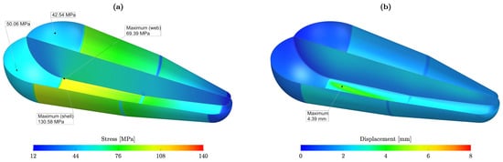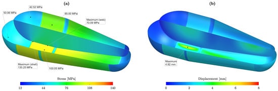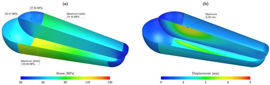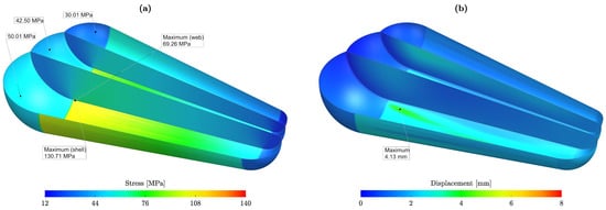 The next validation case is a thin-walled tapered two-segment two-bubble tank that is in agreement with the design properties discussed in Section 2.3.3. The 3D geometry of such a tapered two-bubble tank featuring two segments and a planar web is generated following the step-by-step design process shown in Figure 8 for . Figure 7 serves as a 2D template for the geometry descriptors. With six () independent geometry descriptors in , the geometry is fully defined (Section 2.3.2). All size parameters (, and ) and the angles and are selected as independent geometry descriptors, fully defining the geometry of the first segment. The angle is also selected as an independent geometry descriptor to obtain six independent geometry descriptors in . The lengths and are two additional independent geometry descriptors alongside the six independent geometry descriptors , , , , and . The numerical values for this total set of eight independent geometry descriptors are listed in Table 3. For this selection of independent geometry descriptors, the geometry is fully defined. The remaining geometry descriptors are , , , , , and and their numerical values are extracted from the fully defined sketch in the Siemens NX environment and added to Table 3. The geometry descriptors in Table 3 satisfy the expressions in Equations (10) and (11), and the web resulting from the intersection of the two bubbles is planar in the 3D model in NX.
