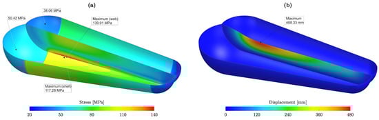 For an internal differential pressure and uniform shell thickness , Figure 13 shows the FE stress and displacement results in the tapered two-segment two-bubble tank. Five observations are made based on Figure 13:
