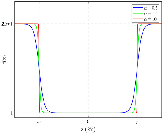 In the adaptive function in Equation (13), employing the Cholesky decomposition ensures that transformed matrix retains its symmetry; thus, is the Cholesky decomposition of matrix . The function is the adaptive function, where denotes the threshold, represents the rate at which the function increases above the threshold, affects the function maximum, and denotes the ith measurement. The function plot is shown in Figure 2.
