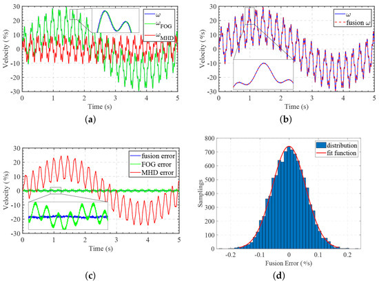 Figure 3a shows that the FOG measurements were inadequate for ensuring measurement accuracy in the middle- and high-frequency ranges, whereas the MHD sensor failed to capture low-frequency motion. Figure 3b presents the result obtained after Kalman filter fusion, with the fused output aligning well with the original velocity. Figure 3c compares the measurement and fusion errors, revealing that the latter remained nearly constant, while the measurement errors contained multiple frequency components. A statistical analysis of the fusion error was conducted, and Figure 3d demonstrates that the fusion result follows a normal distribution, effectively preserving the individual frequency components of the signal.