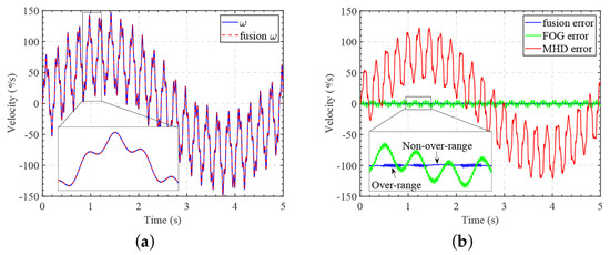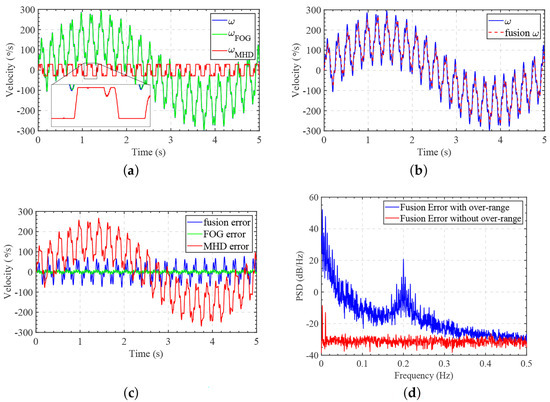 Figure 4a shows that the measurement range of the MHD sensor was limited to 0.5 rad/s, and when the signal exceeded this range, accurate measurements were no longer possible. Figure 4b,c present the results and errors, respectively, obtained after Kalman filter fusion, showing significant errors in the fused results due to the distortion caused by measurement saturation. Figure 4d demonstrates that the error included all frequency components of the signal, in contrast to the fusion results, where no over-range signal was produced, indicating that the fusion results were severely distorted.