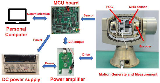 The experimental setup shown in Figure 9 consisted of a PC, a microprocessor STM32 board, a servo turntable, an MHD sensor, and a FOG. The turntable generates the required motion. The two sensors measured the angular velocity of the turntable. Moreover, the STM32 board was employed for turntable control, data acquisition, and fusion processing.