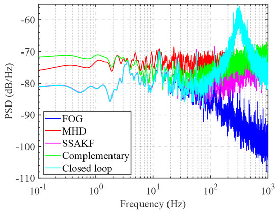 Figure 10 shows the static noise PSD of different methods. The noise PSD of the SSAKF method transitioned smoothly from the low-frequency FOG noise level to the high-frequency MHD noise, remaining relatively flat. Moreover, the noise of the SSAKF method consistently remained between the MHD and the FOG, with its time–domain RMS being lower than that of other fusion methods. Because of model inaccuracies, the complementary filtering method exhibited higher noise power density at low frequencies compared with other methods, and the high-frequency also presented higher noise levels. The closed-loop combined filtering method produced peaks when transitioning to the high-frequency band, leading to an increase in the noise level. Table 4 also shows that the mean values of the methods were almost at the same level, while the RMS and mean values of the SSAKF were lower than those of the other two methods, indicating the superiority of this method under static conditions.