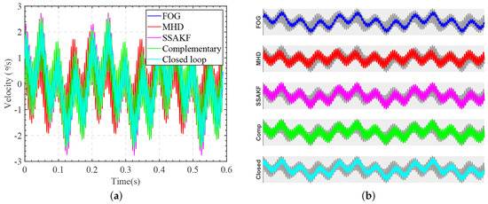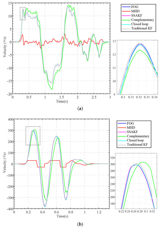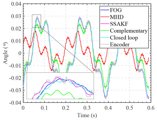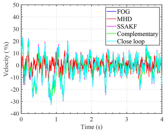 The experimental results are shown in Figure 11. The velocity signal revealed certain differences in the fusion results produced by different methods. However, these differences could not be effectively compared directly from the velocity signal. Therefore, the measurement and fusion results were integrated to obtain the corresponding angles, which were then compared with the encoder value.