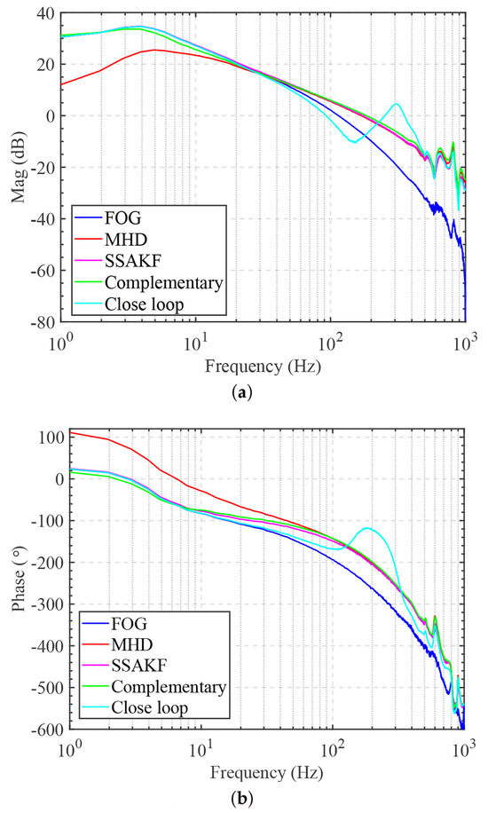 By ignoring the influence of the mechanical structure and using the frequency–domain response results of the FOG and MHD as the benchmark, we see that the complementary filtering method had some errors in the frequency domain due to an inaccurate model. Because of the existence of the transition band of the closed-loop filter, the closed-loop combined filtering method produced unexpected results in the middle band.