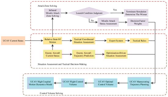 The block diagram of the UCAV air combat maneuvering decision-making model established in this paper is shown in Figure 2. UCAVs acquire the state information of its own and the enemy’s aircraft through sensors in real time, match the corresponding tactics from the knowledge library of the expert system according to the results of the tactical coordinated situation assessment and obtain the adaptive decision-making objective function factor through the real-time solving of the infrared missile attack area. After that, the trajectory prediction of the enemy aircraft is carried out, and the optimization-driven situation assessment is carried out using the prediction results to improve the decision margin. Finally, the above results are combined to plan the trajectory of each UCAV and solve the corresponding optimal control quantity, which is then sent to the flight control computer to control the UCAV to perform the corresponding maneuvers, and the above steps are repeated until the air battle is won.