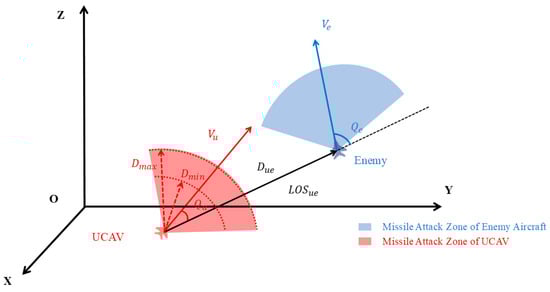In the study of this paper, the air combat scenario is a 2v1 WVR air combat. Since information perception is not the focus of this paper, for the convenience of the study we assume that the position, speed, and other situational information of both sides are transparently transmitted to each other. The air combat scenario is shown in Figure 1, in which the blue aircraft represents the enemy aircraft. After acquiring our situation information, the enemy aircraft makes maneuvering decisions in accordance with the principle of avoiding falling into our missile attack zone as much as possible and aiming to form attack conditions on any one of our UCAVs. The red aircraft represents our aircraft. After acquiring the enemy aircraft’s situation information, our aircraft selects the tactics to be executed according to the situation assessment in order to achieve the goal of meeting the launch conditions against the enemy aircraft without damage. Meeting the launch condition means using the WVR infrared missile as the airborne weapon. The fire control module solves the missile attack zone in real time according to the situation of both sides, and the aircraft makes the enemy stay within the attack zone for a sustained period of time through maneuvering.