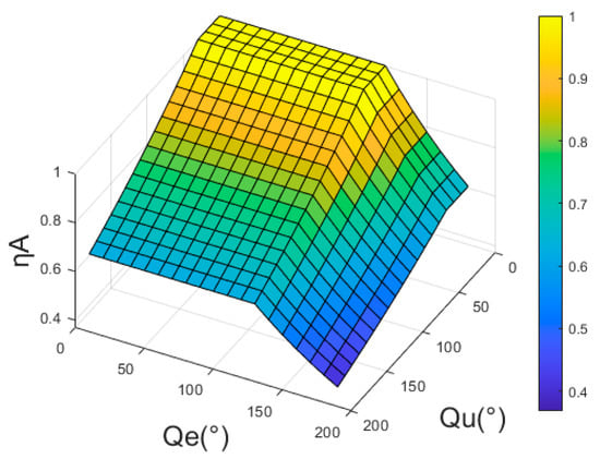 Figure 4 gives an image of the variation of the azimuth assessment function with respect to the azimuth angles and . The azimuthal situation is optimized when the enemy aircraft is located in the UCAV’s attack field of view and the UCAV is outside the enemy aircraft’s attack field of view, at which time . In the head-on or phase-off state, the two sides have an equal azimuthal situation advantage.