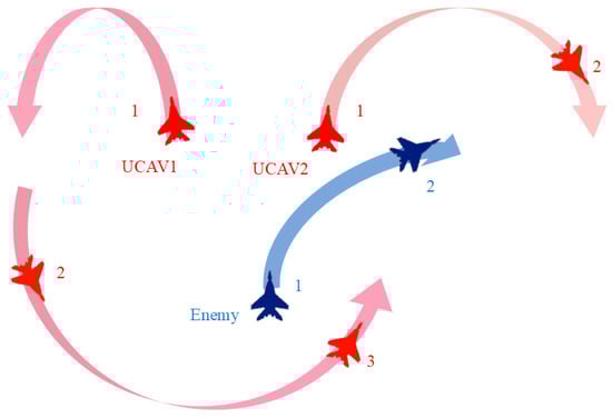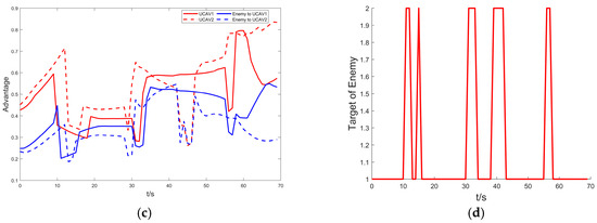 From Figure 11c, we know that the situation of UCAV1 is extremely poor at 51~80 s. At the same time, we choose to adopt the tactic of baiting the enemy to attack. UCAV2 acts as a decoy to bait the enemy to maneuver and takes the initiative to reduce its own value in the situation in exchange for the probability of UCAV1’s survival. Then, we counterattack together with our two UCAVs after they are safe.