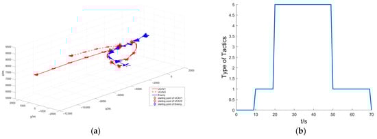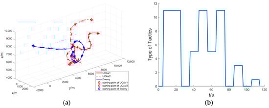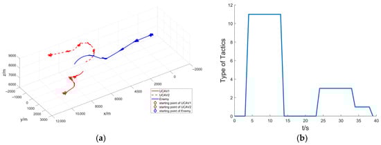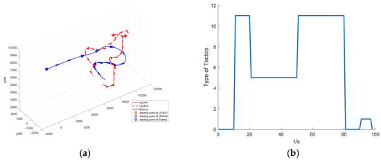 Figure 9b visualizes the tactics adopted by our formation, and different values on the vertical coordinate represent different tactics. As shown in the figure, our tactical decision-making process can be divided into five phases: approaching flight (0~4 s), bait attack (4~13 s), contract attack (14~23 s), up-down pincer attack (24~33 s), and cover attack (34~39 s).