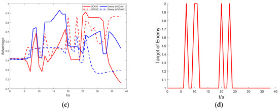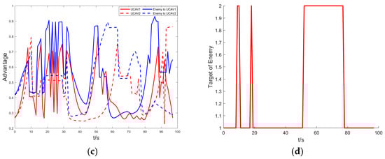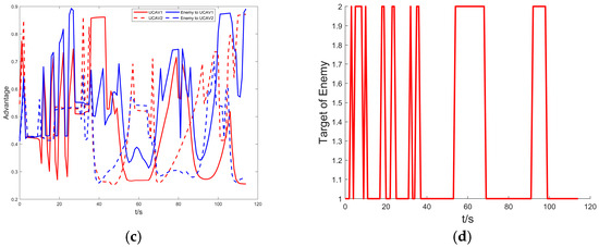 In summary, during the air confrontation, the tactical rules are dynamically switched according to the triggering event. The target selection of the enemy aircraft is shown in Figure 9d, and it can be seen that since UCAV1 is at an altitude disadvantage, the enemy aircraft is maneuvering with UCAV1 as the attack target most of the time. In the bait attack phase, UCAV2 acts as a decoy, causing the enemy aircraft to change its attack target, thus giving up the advantage it has. It is through tactical coordination, utilizing constant changes in roles and tactics, and sacrificing some of our advantages to neutralize the original advantages of the enemy aircraft, that we ultimately make the enemy aircraft fall into a disadvantage until they are destroyed.