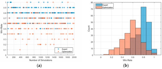 The win rate comparison with the method based on optimization algorithms (bigger is better): (a) one discrete point in the subfigure corresponds to the average win rate of 10 MC trials; (b) depicts the distribution of win rate.
