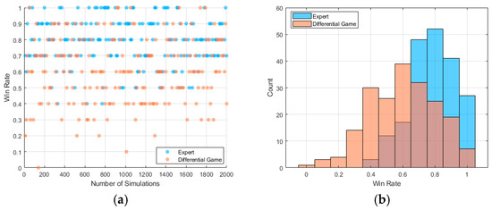 The win rate comparison with the method based on differential game algorithms (bigger is better): (a) one discrete point in the subfigure corresponds to the average win rate of 10 MC trials; (b) depicts the distribution of the win rate.