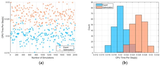 To assess the real-time performance of the proposed decision-making method, we compared the average CPU time per step between the proposed method and the maneuver decision-making method based on optimization algorithms, as shown in Figure 15. The comparison results showed that both methods can achieve decision making at the 0.01 s level, but the method proposed in this paper seems slightly faster. Our hypothesis is that the specific state rule classification in the hierarchical expert system allows the agent to search less state space at each step, consuming less time.