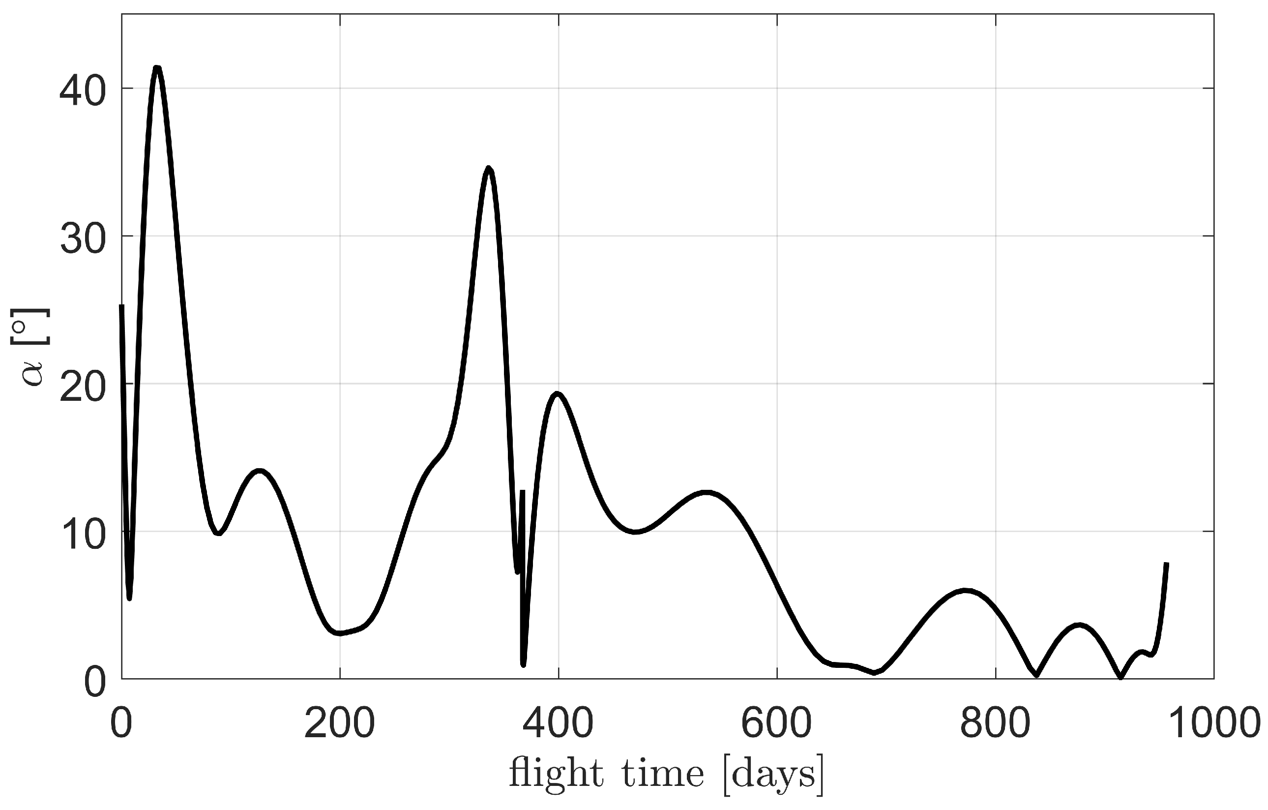 - Quarta, A.A. Impact of Pitch Angle Limitation on E-Sail Interplanetary Transfers. Aerospace 2024, 11, 729. [Google Scholar] [CrossRef]