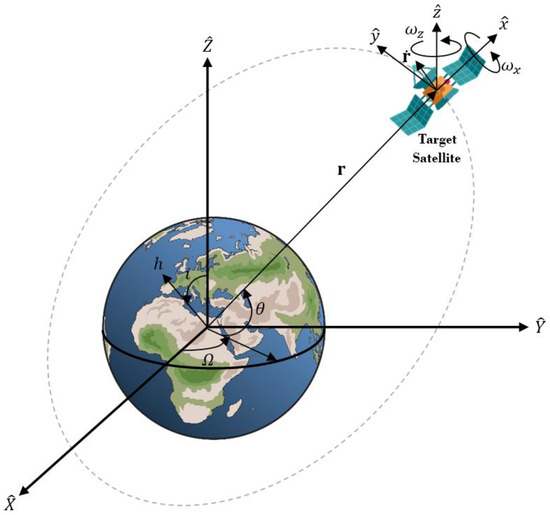 By manipulating Equations (A1), (A6) and (A10), the orbital rate and steering rate can be computed as demonstrated in Equations (17) and (18). Then, by utilizing Equations (A5), (A10), (17) and (18), the system of equations pertaining to the target satellite can be derived, as described in Equations (1)–(6).