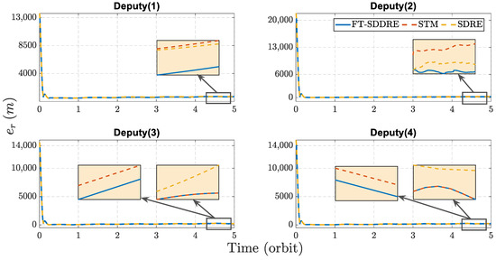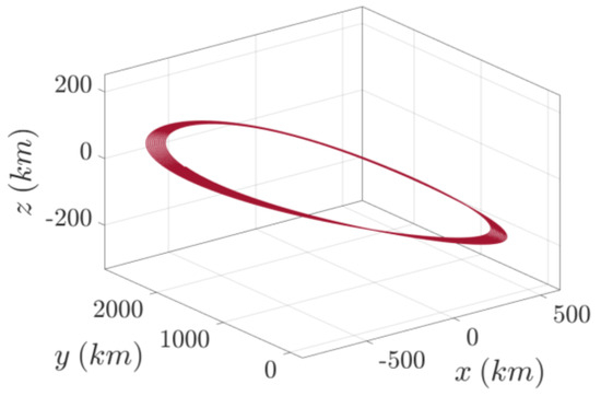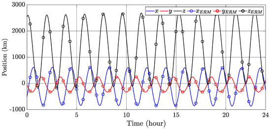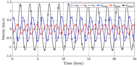 Figure 3 illustrates the deputy trajectory around the target in the LVLH frame, based on the initial orbital elements provided in Table 1. To further assess the model’s accuracy, Figure 4 and Figure 5 are plotted that present a comparison between the relative motion model in terms of position and velocity and the ERM model in a 24 h period. The results demonstrate the high precision of the proposed model, with a root mean square error of for the position and for the velocity. This level of accuracy highlights the model’s effectiveness and its potential advantages for advancing satellite formation flying.