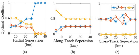 The variation in the optimal values of , , and in the scenarios with radial motion only (a), along-track motion only (b), and cross-track motion only (c).