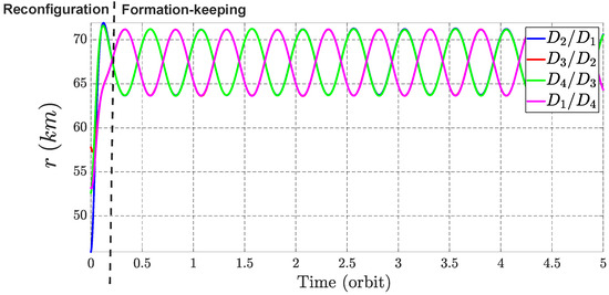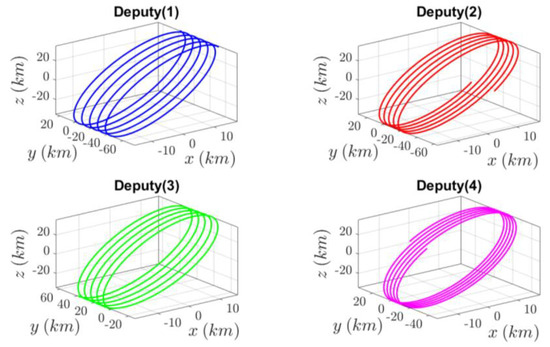 The obtained equations of the motion for both the deputy and target satellites are precise and free from approximations. They accurately account for short-term and long-term effects, including secular effects. This model’s versatility is evident in its suitability for long-duration flights and its applicability to both formation-keeping and reconfiguration missions [33]. For additional information regarding the derivation and coefficients used, please refer to Appendix A.