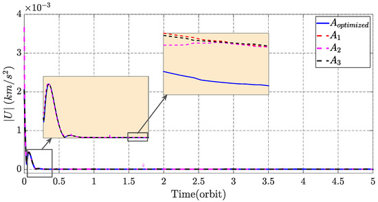 In the second stage, to identify the ideal SDC parameterization that minimizes energy consumption while completing the mission within the predetermined time frame and under the same initial and desired conditions, three distinct matrices—, , and —are considered. These matrices, which are derived in Appendix B, differ in the state-independent terms of the relative motion equations, as detailed in Appendix B. The relation between the optimized layout of the SDC and the primary configurations is formulated in Equation (39):
