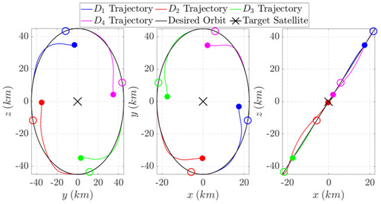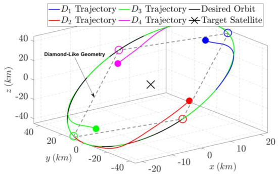The next step in the satellite formation flying control scheme is to design the satellite formation geometry for multi-angular Earth observation missions, which require capturing images from multiple angles within a short time frame to minimize scene changes. A single satellite typically lacks this capability, making it essential to develop a satellite formation geometry that enables multiple satellites to capture images of the same area within the required time frame. This requirement highlights the projected circular orbit (PCO) formation as the most effective configuration as it provides the most angular diversity at the target area, thereby enhancing the quality and precision of the observations [59]. In PCO formation, satellites maintain a fixed relative position within the plane, enabling them to capture overlapping images from different perspectives, which is vital for high-resolution imaging and creating precise three-dimensional models [60].