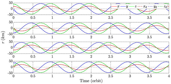 In order to design reference trajectories for deputy satellites that ultimately result in a PCO formation geometry, it is possible to utilize the Hill–Clohessy–Wiltshire (HCW) equations, which outline the linearized relative motion of a deputy concerning a target in a circular earth orbit. This step serves as the guidance component of the control system, determining the desired position and velocity of the deputy satellites relative to the target at each time step, which must then be tracked accordingly [61]. These equations are presented in Equations (40)–(42).