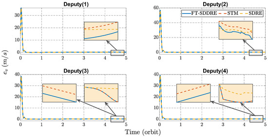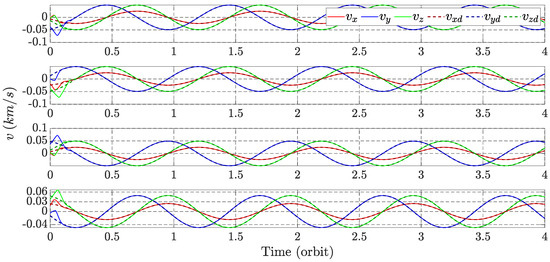Similarly to the target’s equations of motion, the equations governing the relative motion, which account for all zonal harmonics and atmospheric drag, are presented in Equations (10)–(12). These equations provide a comprehensive model that incorporates the key perturbative forces affecting satellite dynamics, ensuring accurate predictions for both short-term and long-term satellite formations.
