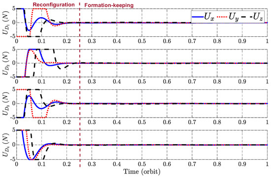 In recent years, the research on formation flying is a hotbed of innovation [14] that encompasses various methods for formation control, addressing different facets of the issue, including relative spacecraft control, coupled mission objectives, and global fuel minimization [15]. When it comes to formation coordination approaches, formation control can be divided into some categories; for example, Leader/Follower, Virtual Structure, Behavior-Based Approach, Orbit Tracking, and Swarming [16]. Sparks [17] studied the effectiveness of LQR for satellite formation-keeping under the influence of gravity perturbations using the Clohessy–Wiltshire equation. Capó-Lugo and Bainum [18] employed the Carter–Humi equation and developed an LQR controller to preserve the separation between a pair of satellites. Scala [8] recently discussed employing MPC and LQR controllers for formation-keeping and reconfiguration problems, considering a system of relative orbital elements equation that accounts for drag perturbations in different geometry and numbers of satellites.
