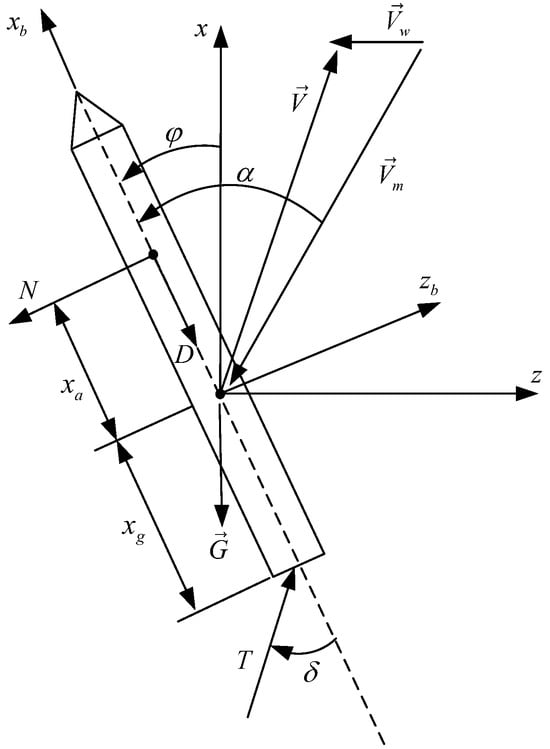 Here, represents the vertical inertial coordinate system, where the x-axis serves as the vertical reference axis and the z-axis serves as the horizontal reference axis. represents the body coordinate system, denotes the point of application of aerodynamic forces, and indicates the position of the launch vehicle’s center of mass.