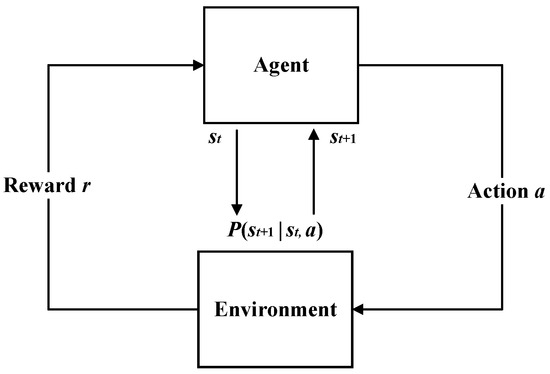 For RL, the agent and the environment are two critical elements. The core mechanism of RL involves continuous interaction between the agent and the environment, accumulating experience, and updating the policy to ultimately train an optimal policy. Essentially, RL solves an MDP, which is typically represented as a four-tuple , where S represents the state space, A represents the action space, P represents the state transition probability, and R represents the reward function. During training, the agent observes the current state, , of the environment and takes an action, . The environment then transitions from state to , according to the transition probability P, while providing a reward, . This fundamental principle of RL is illustrated in Figure 2.