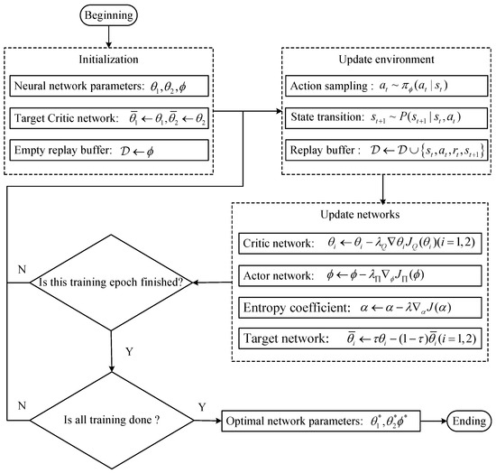 SAC is one of the DRL algorithms based on a stochastic policy, and it enhances the robustness of policy optimization by introducing entropy. The effectiveness of the SAC algorithm has been verified in some applications of automatic control systems. Reference [22] developed an autonomous aerial combat strategy for UAVs based on the SAC algorithm, enabling UAVs to autonomously analyze aerial combat situations. Reference [23] proposed an autonomous path planning method for multi-arm robots based on the SAC algorithm in response to the complex terrain environment within the working area. Reference [24] designed navigation and control methods for autonomous underwater vehicles using the SAC algorithm, addressing the characteristics of complex external disturbances in the marine environment. The above references prove that the SAC algorithm has adopted effective strategies to overcome environmental randomness and achieved the desired results.