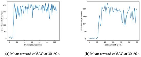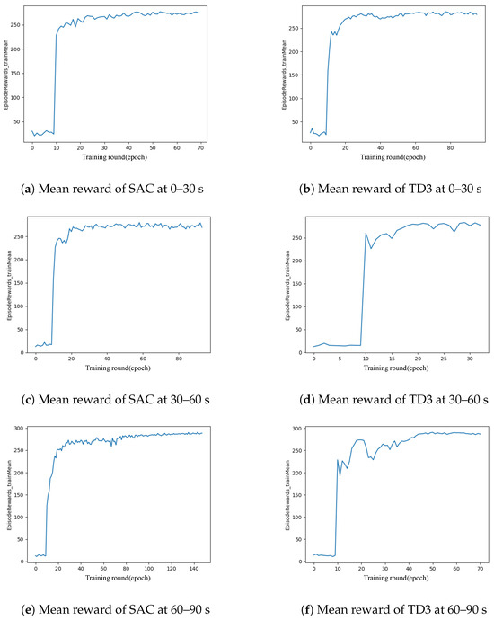 As can be seen from Figure 6, the agent completed 70 and 96 training epochs in the 0–30 s phase, 94 and 33 epochs in the 30–60 s phase, and 148 and 71 epochs in the 60–90 s phase under the SAC and TD3 algorithms, respectively. None of the above training sessions reached the maximum number of training epochs. This was due to the inclusion of the early stopping logic, which terminated training when the agent’s performance no longer showed significant improvement. Overall, the mean reward under the SAC algorithm demonstrates better convergence. Although the mean rewards exhibit slight fluctuations during training under both algorithms, the mean reward under the proposed SAC algorithm consistently showed an overall upward trend, whereas, under the TD3 algorithm, the reward function experienced several oscillations, particularly during the 30–60 s and 60–90 s phases. In addition, the agent underwent significantly more training epochs in total under SAC compared to TD3 within similar time consumption. Based on the analysis of the aforementioned results, it can be concluded that the SAC method demonstrates significant advantages in terms of both training efficiency and training effectiveness.
