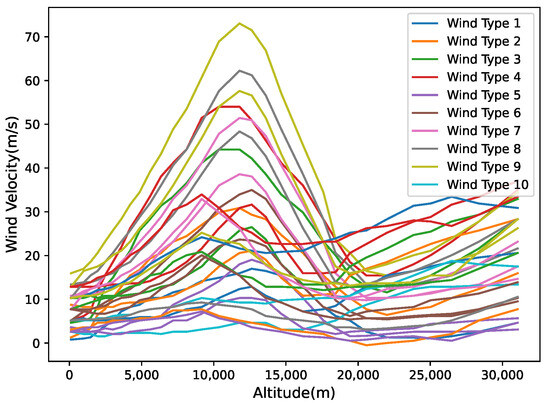 As previously mentioned, the launch vehicle encounters uncertain wind disturbances from the high-altitude wind region during its ascent phase. Based on the actual measured data of 10 types of wind disturbances from a specific launch site, an additional 20 wind patterns were randomly generated, resulting in a total of 30 wind patterns. During training, wind disturbances are cyclically changed to improve the controller’s adaptability. It is assumed that only the vertical wind shear, i.e., the variation of wind speed with flight altitude, is considered. The vertical shear curve is shown in Figure 7. It is noted that due to limited space in this figure, we have only labeled the curves corresponding to the original 10 wind patterns.