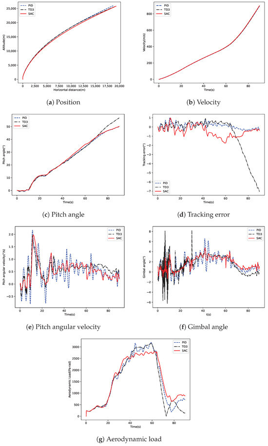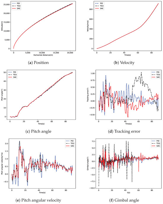 First, the three controllers were all tested in the no-wind scenario for a direct comparison of the pure attitude control. Figure 9 presents the simulation results for the SAC controller, TD3 controller, and PID controller, where subfigures (a)∼(f) respectively illustrate the curves of the position, velocity, pitch angle, tracking error, pitch angular velocity, and gimbal angle of the launch vehicle. Key data of the aforementioned parameters are presented in Table 3 to provide a more intuitive comparison of the performance of each controller.