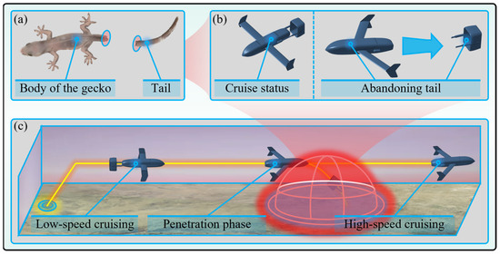 Concept of UAV penetration with imitation of severed gecko tail. (a) Geckos discard their tails and attract the attention of predators through rapid twisting of their tails (b) Glide tail decoy concept (c) UAV penetration process.