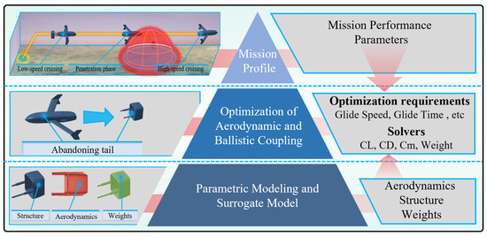 After the tail wing is discarded as a decoy, its flight trajectory in the air directly affects the success rate of UAV penetration. Moreover, the aerodynamic characteristic parameters of the tail wing are closely related to its flight trajectory in the air. Optimizing the aerodynamic characteristic parameters and trajectory parameters of the tail decoy simultaneously is a typical problem of coupling aerodynamic characteristic parameters with gliding trajectory design. As a result, an integrated design framework for the aerodynamic profile and glide trajectory of a tail decoy is established. As shown in Figure 2, the overall design architecture of the pyramid is divided into three layers. The task profile layer is the top-level requirement input end. By sorting out typical task scenario requirements, the task feature parameters that the tail decoy needs to meet are extracted as constraints for the aerodynamic and trajectory coupling design of the tail wing. The coupling optimization layer is the intermediate coupling layer for tail trajectory parameters, aerodynamic data, and shape data. The bottom layer is the parameterized modeling and surrogate model layer. By parameterizing the shape of the tail wing, CFD simulation tools are used to obtain aerodynamic data of the tail wing under typical working conditions. Finally, the surrogate model is used to generate aerodynamic data of the tail wing in the full sample space, which are input into the coupling optimization layer as necessary parameter support for trajectory calculation.