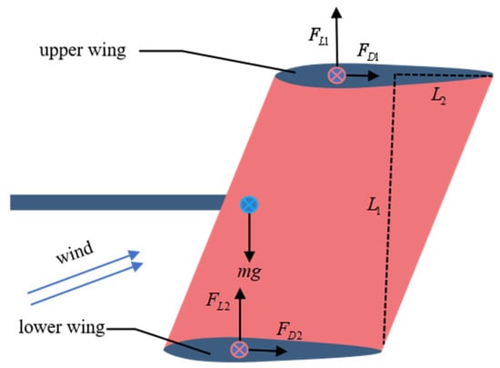 As shown in Figure 3, the tail decoy in this paper is a ducted tail, based on the authors’ previous research results [22,23]. The relative position of the upper and lower airfoils of a ducted tail affects its aerodynamic performance, which, in turn, affects the trajectory of the tail decoy as it glides through the air. Therefore, the relative positions of the upper and lower airfoils of the tail decoy are parametrically modeled, and the forces acting on them are analyzed.